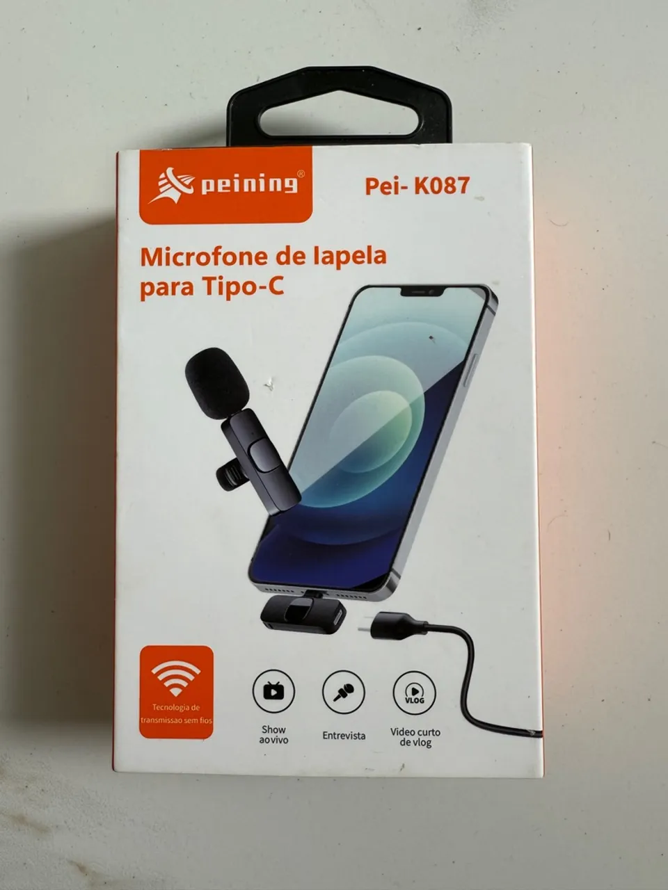 Microfone de lapela Peining para celulares com entrada Tipo-C. Ideal para shows ao vivo, entrevistas e vídeos de vlog. Tecnologia de transmissão sem fios.