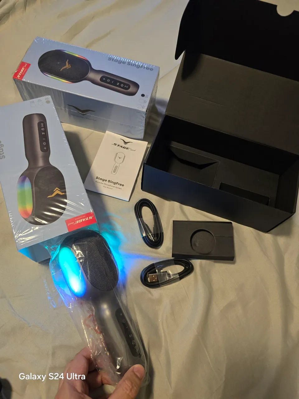 02 Microfones karaokê sem fio Stage SingFree, microfone Bluetooth portátil 5-em-1 com 4 modos de som, RGB luz, alto-falante embutido, máquina karaoke profissional para carro party, presente para infantil e adulto.