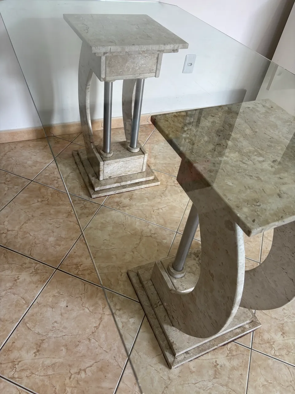Linda mesa com design moderno e elegante, perfeita para diversos ambientes. Seu tampo em vidro e base de mármore diferenciada agregam sofisticação ao seu espaço.