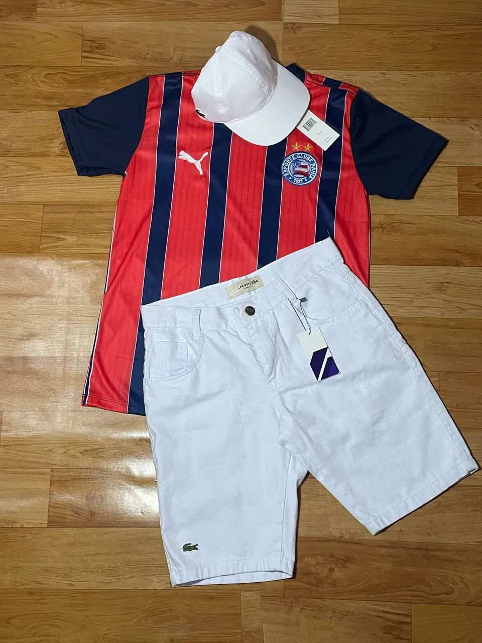 Conjunto perfeito para o seu dia a dia! Uma camisa de time vibrante, combinada com um short branco elegante e um boné para um toque final. Conforto e estilo em uma só peça.