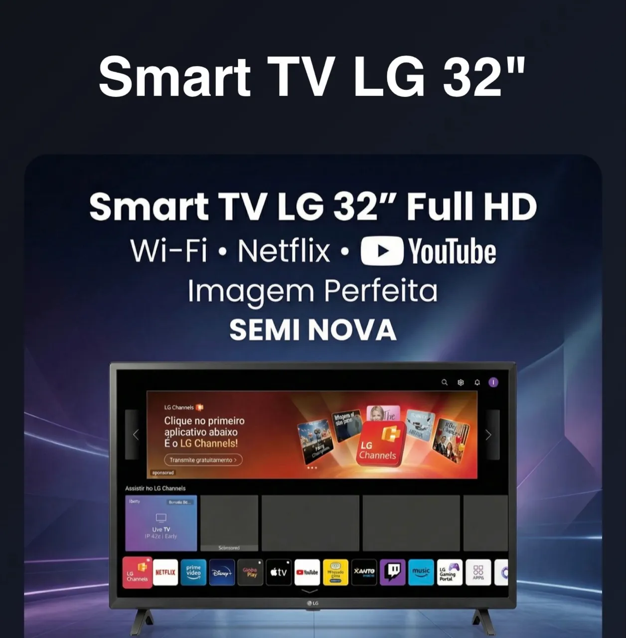 Aproveite a experiência de cinema em casa com esta Smart TV LG de 32 polegadas! Com imagem Full HD e Wi-Fi, você terá acesso a Netflix e YouTube. Semi nova e em perfeito estado, garanta já a sua!