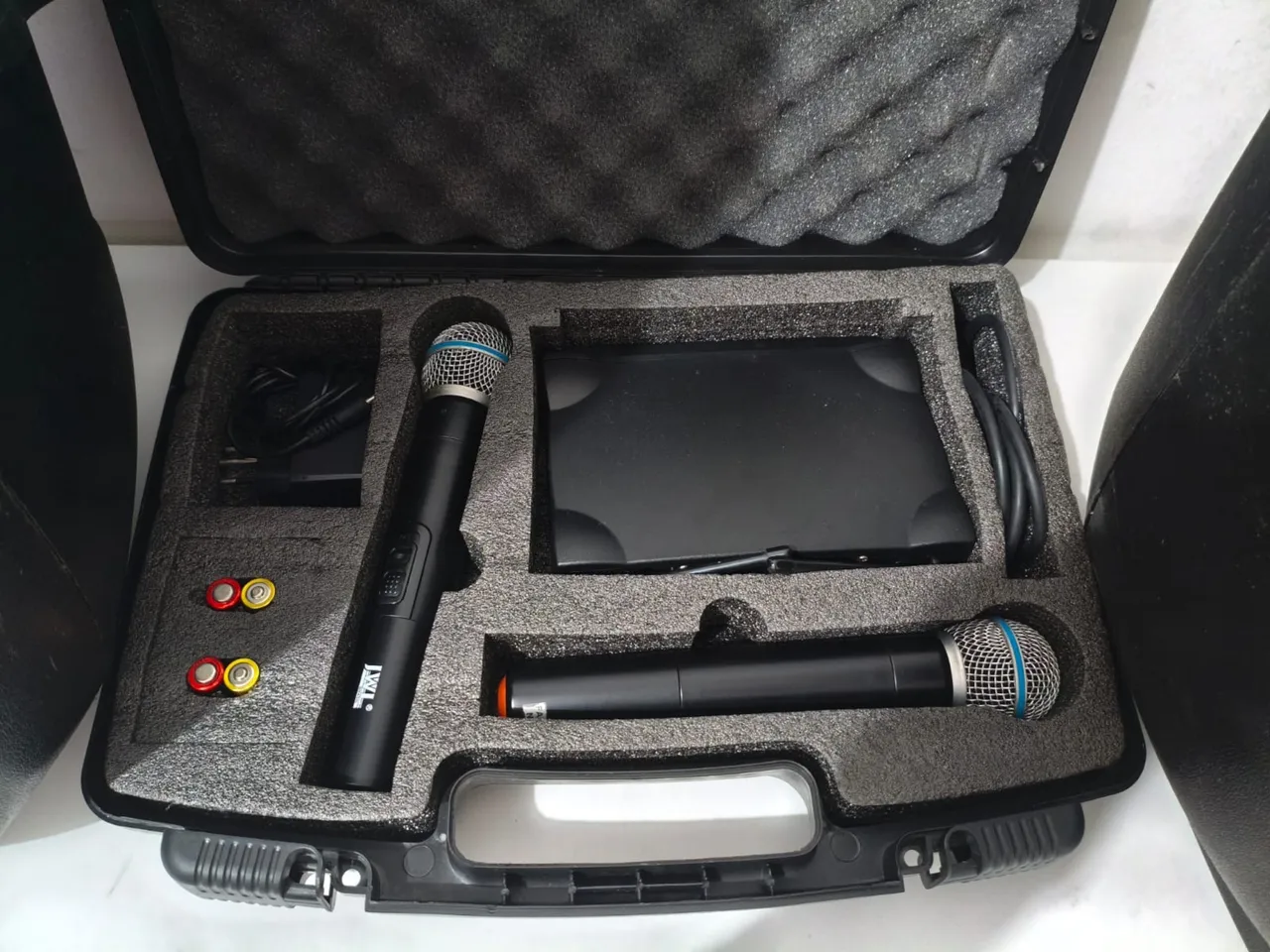 Microfone sem fio para você se apresentar com qualidade e sem fios! Som nítido e fácil de usar. Perfeito para eventos, shows e muito mais.Composto por 2 cx de som uma ativa e outra passiva 2 microfones, 1 pedestal para microfone e ainda acompanha este móvel para vc guardar seu som