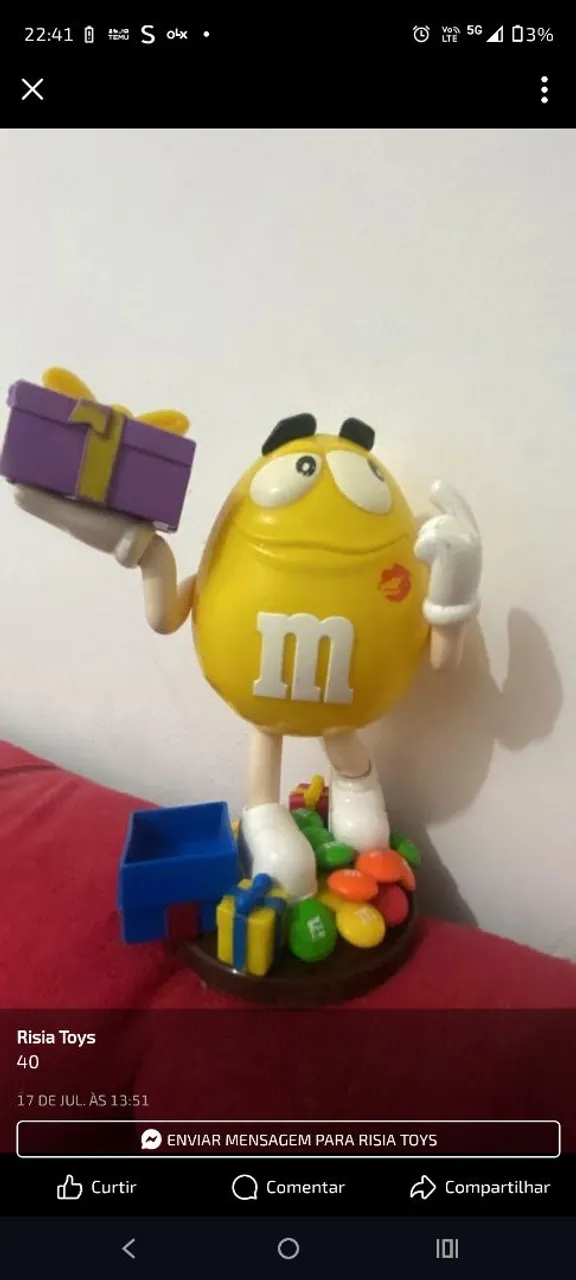 Linda action figure do personagem M&M's amarelo, perfeito para colecionadores e amantes da marca. Detalhes incríveis e cores vibrantes! Está com marcas de uso,.tem um pouco de ralado