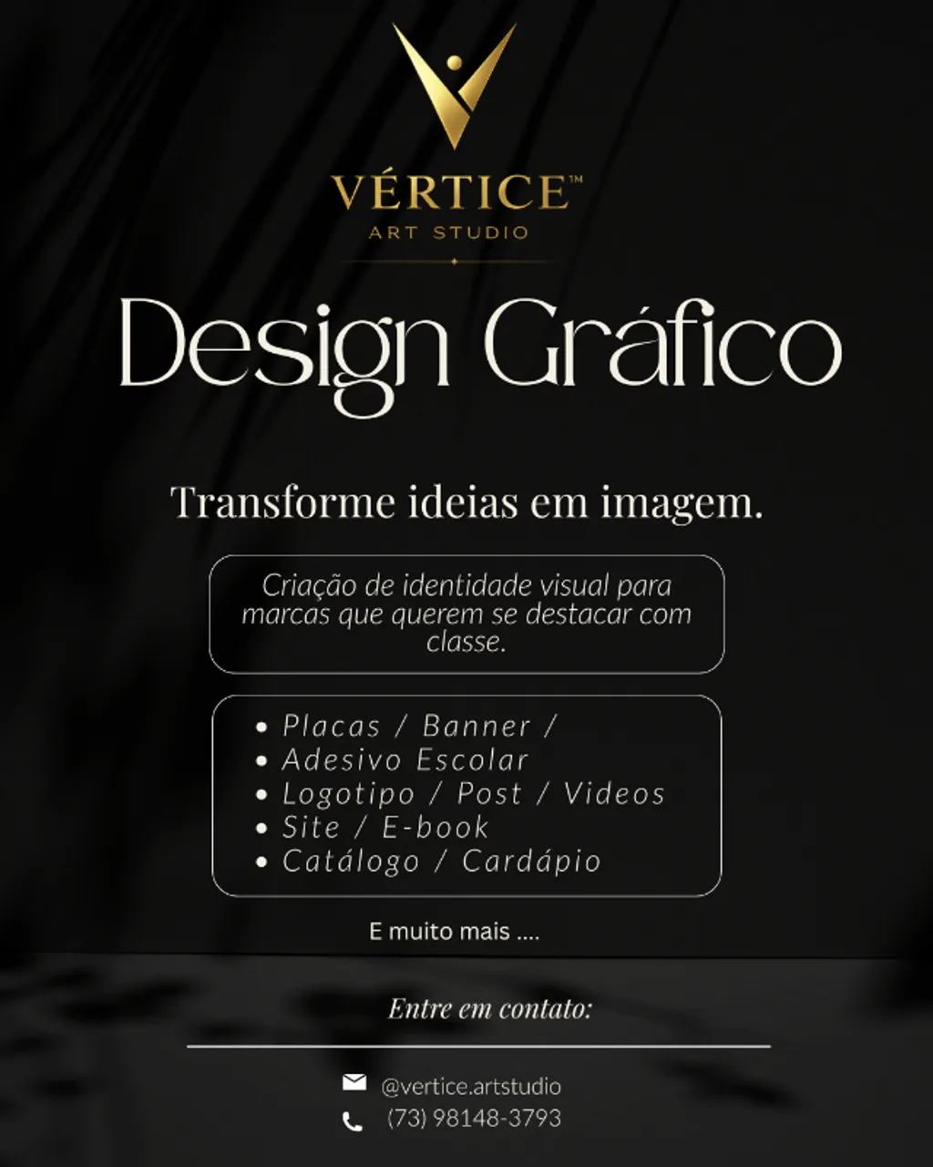 Precisando de *artes gráficas* ou *serviços online*? Transformo sua ideia em imagem e seu problema em solução. ? VÉRTICE ART STUDIO Sua marca no próximo nível.